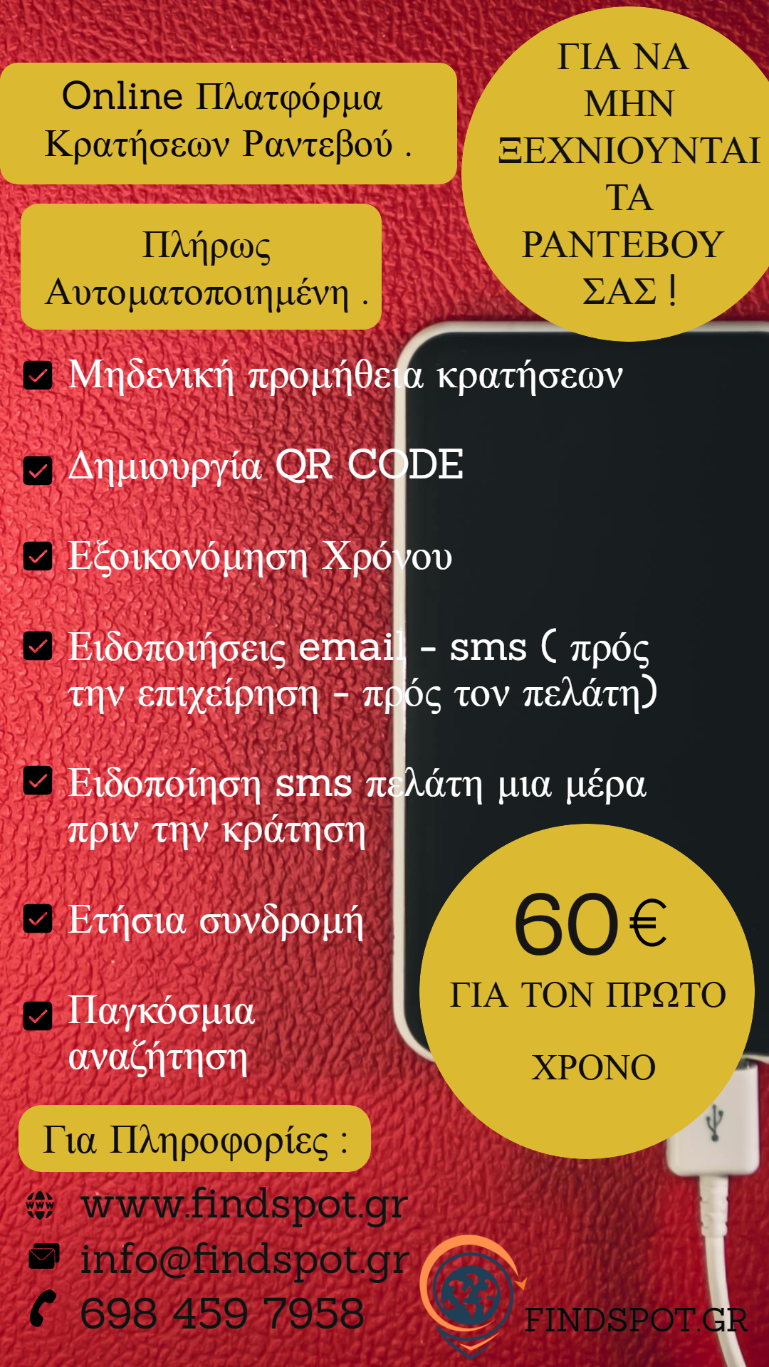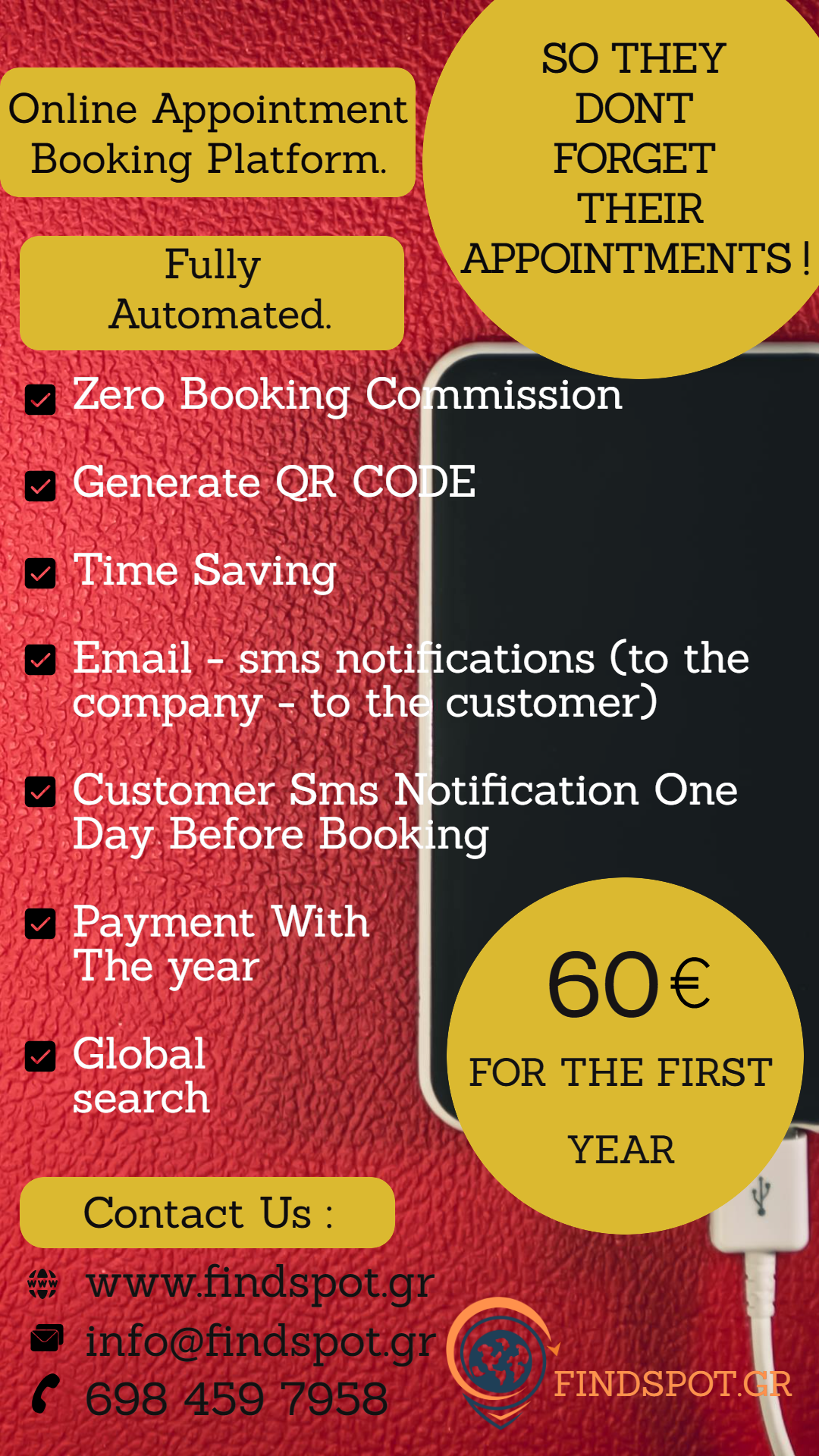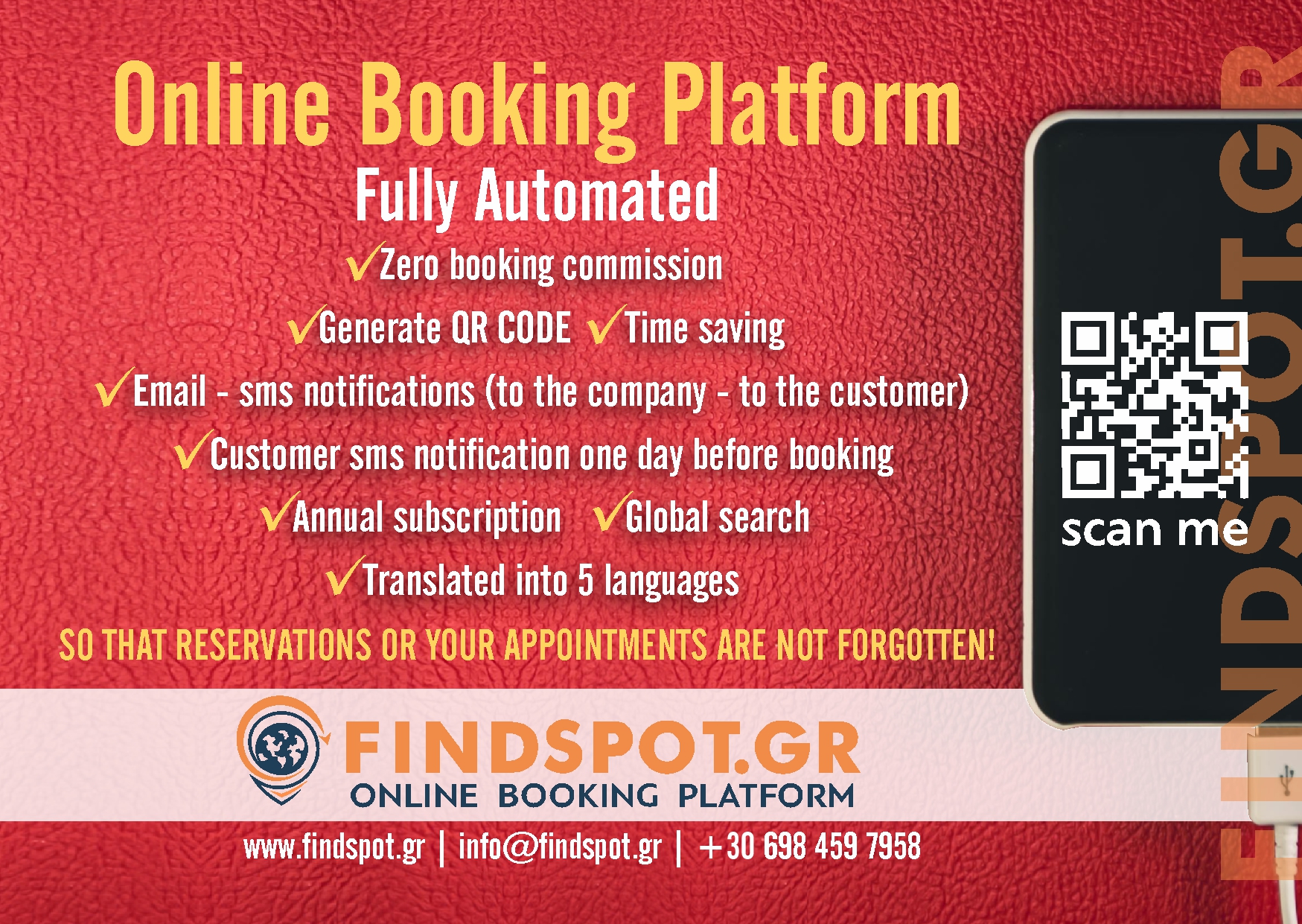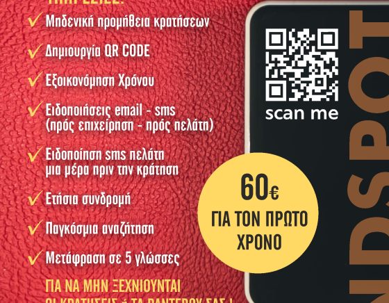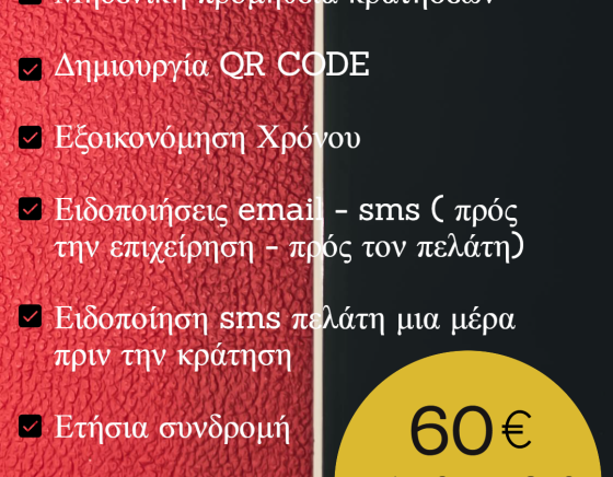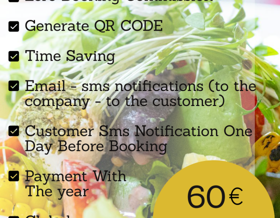 Ανακαλύψτε την απόλυτη λύση οργάνωσης και προβολής για την επιχείρησή σας με την Online Πλατφόρμα Κρατήσεων και τον Παγκόσμιο Επαγγελματικό-Διαφημιστικό Οδηγό Gluten Free SPOT. Ξεχάστε το άγχος των χαμένων ραντεβού και των χαμένων κρατήσεων: η πλατφόρμα μας φροντίζει να οργανώνονται αυτόματα όλα τα ραντεβού σας, ενώ εσείς και οι πελάτες σας λαμβάνετε ειδοποιήσεις μέσω email και SMS. Επιπλέον, οι πελάτες λαμβάνουν υπενθύμιση μία ημέρα πριν τη κράτηση, εξασφαλίζοντας ότι κάθε ραντεβού πραγματοποιείται χωρίς καθυστερήσεις και απρόοπτα. Με μηδενική προμήθεια, δημιουργία QR CODE και ετήσια συνδρομή, μπορείτε να εξοικονομήσετε χρόνο και να διαχειρίζεστε τις κρατήσεις σας από οποιοδήποτε smartphone, tablet ή PC, με πρόσβαση σε πραγματικό χρόνο, ακόμη και εξ αποστάσεως.