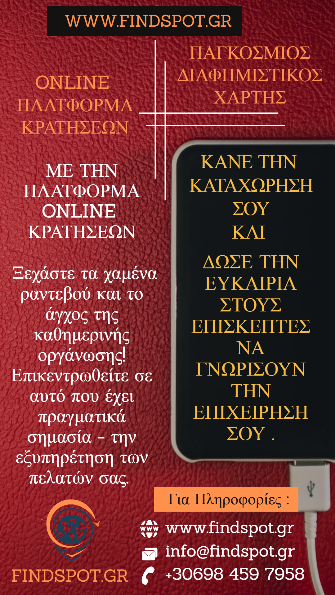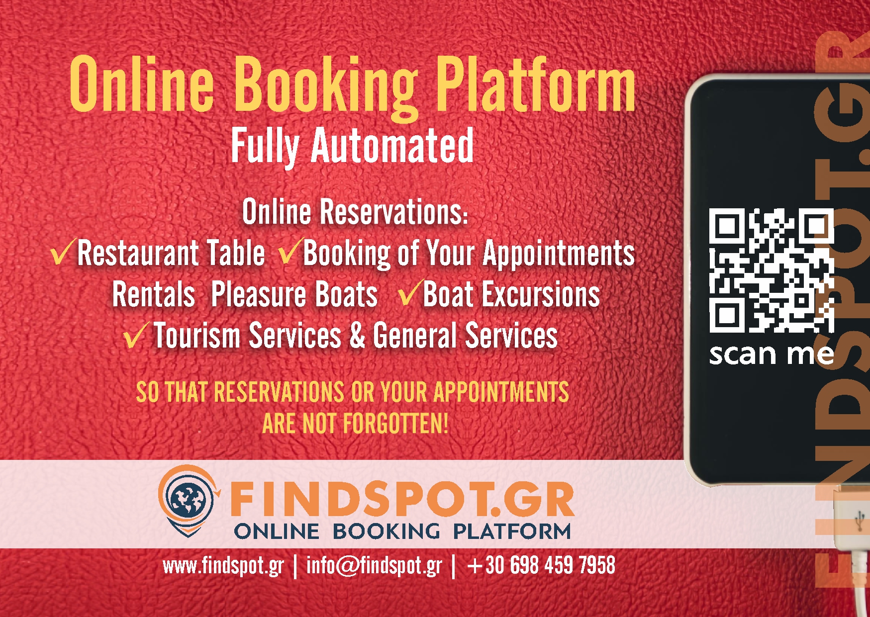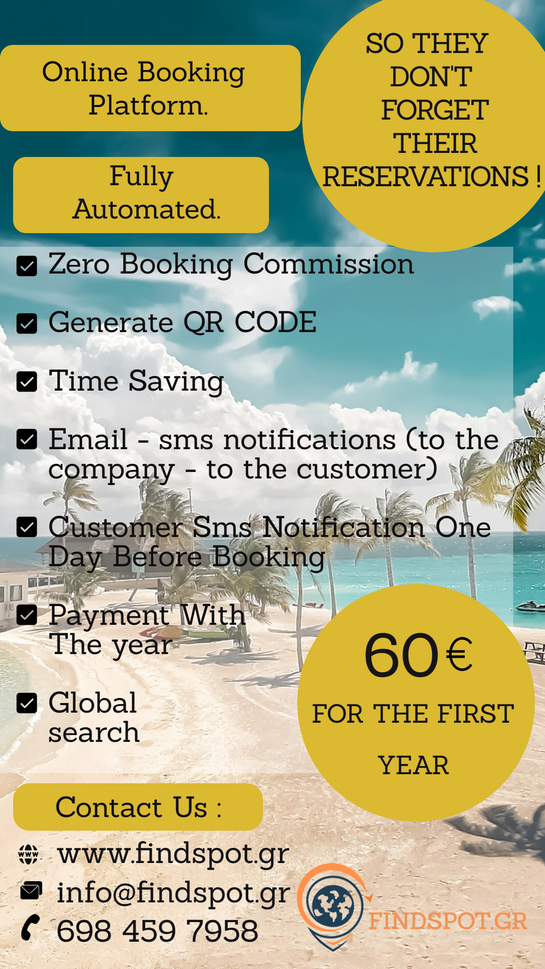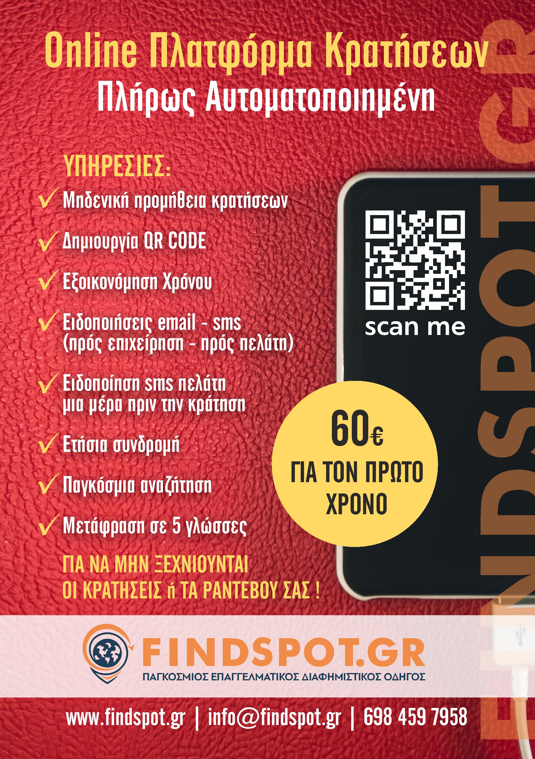Ανακαλύψτε την απόλυτη λύση οργάνωσης και προβολής για την επιχείρησή σας με την Online Πλατφόρμα Κρατήσεων και τον Παγκόσμιο Επαγγελματικό-Διαφημιστικό Οδηγό Gluten Free SPOT. Ξεχάστε το άγχος των χαμένων ραντεβού και των χαμένων κρατήσεων: η πλατφόρμα μας φροντίζει να οργανώνονται αυτόματα όλα τα ραντεβού σας, ενώ εσείς και οι πελάτες σας λαμβάνετε ειδοποιήσεις μέσω email και SMS. Επιπλέον, οι πελάτες λαμβάνουν υπενθύμιση μία ημέρα πριν τη κράτηση, εξασφαλίζοντας ότι κάθε ραντεβού πραγματοποιείται χωρίς καθυστερήσεις και απρόοπτα. Με μηδενική προμήθεια, δημιουργία QR CODE και ετήσια συνδρομή, μπορείτε να εξοικονομήσετε χρόνο και να διαχειρίζεστε τις κρατήσεις σας από οποιοδήποτε smartphone, tablet ή PC, με πρόσβαση σε πραγματικό χρόνο, ακόμη και εξ αποστάσεως.