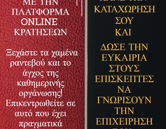 Με την πλατφόρμα μας και τον οδηγό, κάθε επιχείρηση μπορεί να συνδυάσει αποτελεσματική οργάνωση, επαγγελματική προβολή και ποιοτική εξυπηρέτηση πελατών. Απελευθερώστε χρόνο, βελτιώστε την εμπειρία των πελατών σας και αναδείξτε την επιχείρησή σας στο διεθνές επιχειρηματικό περιβάλλον, με ένα ολοκληρωμένο και εύχρηστο ψηφιακό εργαλείο που καλύπτει κάθε σας ανάγκη.