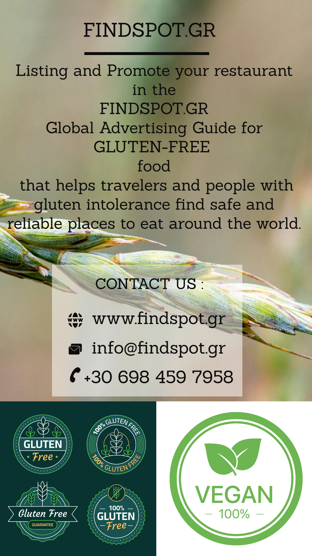 Παράλληλα, μέσα από τον Gluten Free SPOT, η επιχείρησή σας αποκτά διεθνή προβολή. Δημιουργούμε στοχευμένες καμπάνιες στα social media, καταχωρούμε δωρεάν αγγελίες εργασίας και προβάλλουμε την επιχείρησή σας στην πρώτη σελίδα του οδηγού μας. Επιπλέον, προσφέρουμε τη δημιουργία Mini Website, ολοκληρωμένες υπηρεσίες Email Marketing και υποστήριξη HACCP-ISO, δίνοντας στην επιχείρησή σας όλα τα εργαλεία για επιτυχία και αναγνωρισιμότητα.